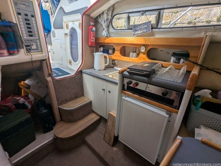 The galley is located on the port side amidships and is equipped with a single stainless-steel sink with pressurised hot and cold water, a two-burner gas hob with grill, a 12V fridge, and ample storage space. Hot water is provided by a engine calorifier system in the engine bay.