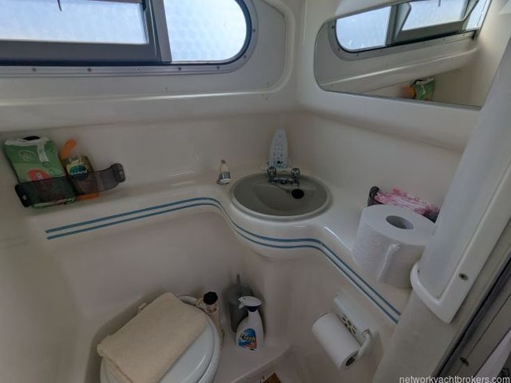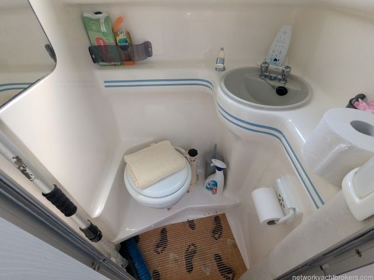 Opposite the galley to starboard is the heads compartment, which includes a marine sea toilet, a single grey sink with pressurised hot and cold water, a separate shower attachment, and a moulded shower tray in the floor.