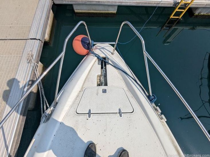 This vessel boasts a sleek white GRP planning hull with a white GRP superstructure with stainless steel hand rails and blue cockpit canopy. The boat was last ashore in 2022 for antifouling, new anodes, outdrive service, and the bellow replaced.