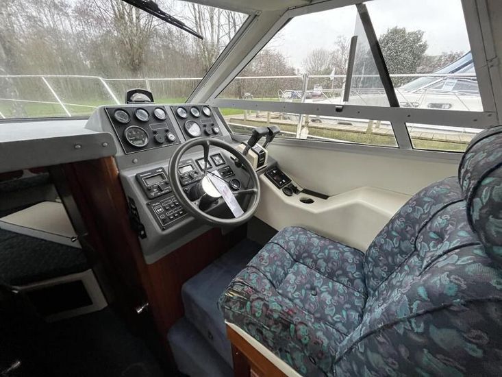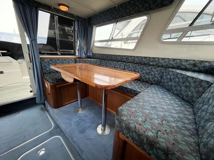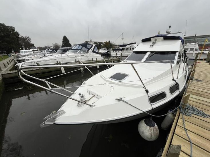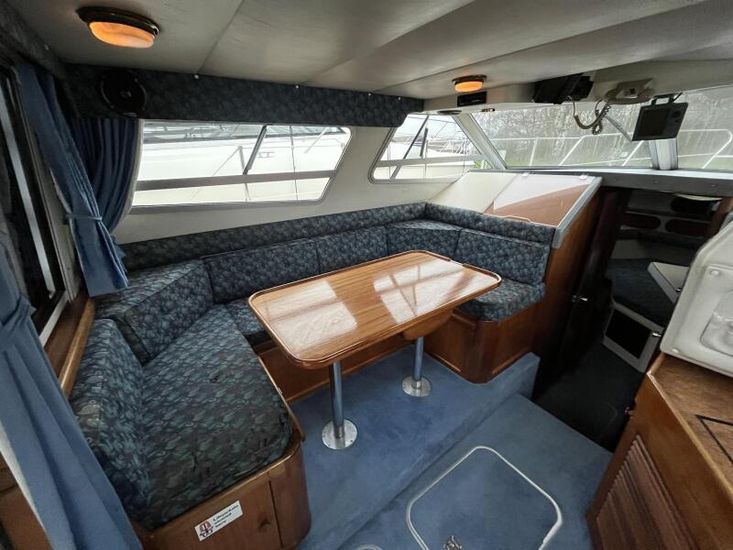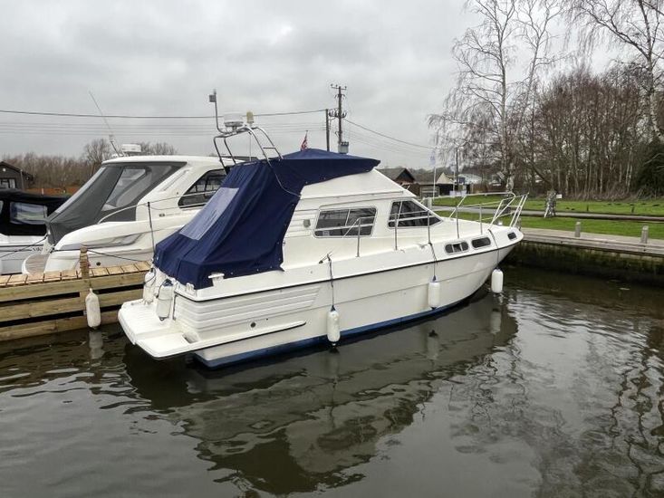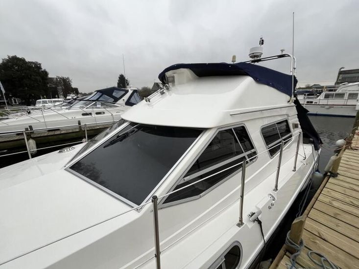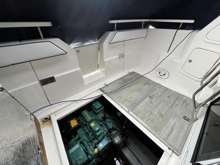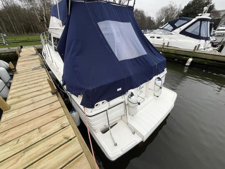 Sealine 305 Statesman - 1989 – Powered by 2 x Volvo AQAD31 140hp diesel engines through sterndrives. Up to 6 berth accommodation over two cabins and saloon with 1 x toilet and shower. Specification including Warm air heating, electric windlass, trim tabs, shore power, battery charger, galley with sink, oven, hob, grill and refrigerator. Generous accommodation in an entry size flybridge with diesel economy. An ideal introduction in to offshore boating. NYA Stock - Sold with 3 month engine & gearbox warranty.